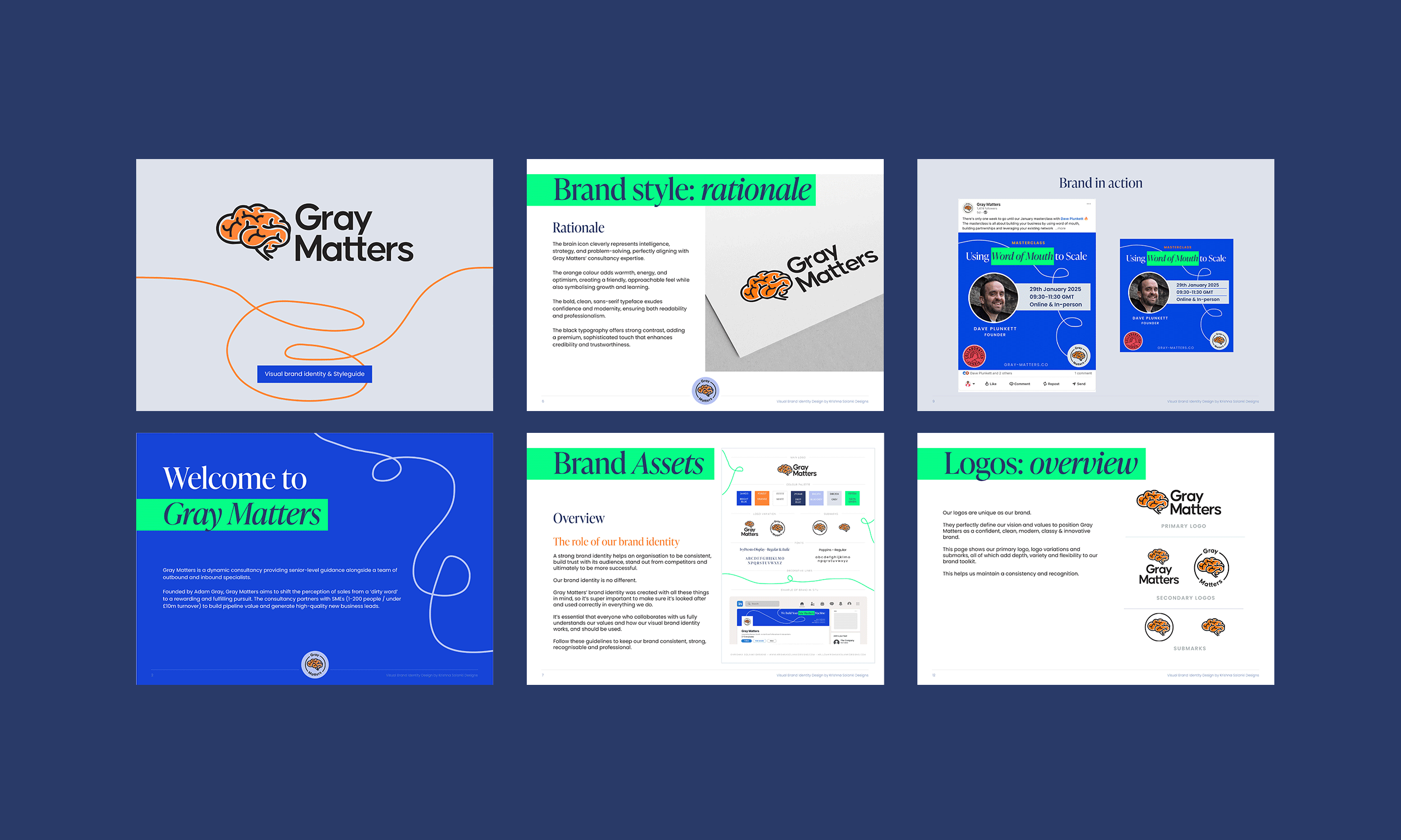 The new Gray Matters brand works beautifully for both audiences, speaking to premium clients while nurturing a community of smaller founder-led agencies. KSD replaced playful cartoon-style graphics with sophisticated visuals that feel more professional and credible.